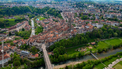 An Panoramic aerial of the old town of the city Fribourg in Switzerland on a sunny day in summer
