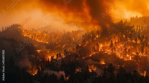 An ultra-sharp and clear image of a forest fire with thick smoke and flames, capturing the devastating effects of global warming on natural habitats, highly detailed