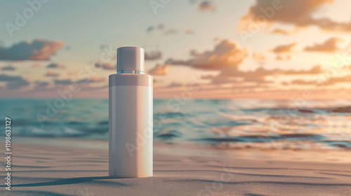 An unbranded cosmetic bottle against a calm beach background