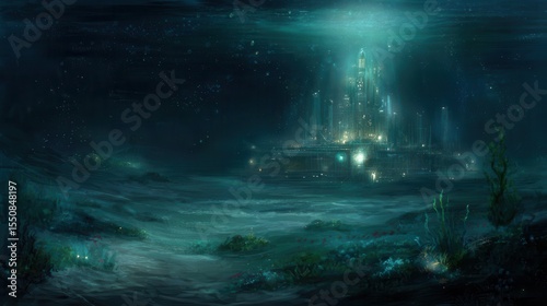 An underwater metropolis bathed in ethereal light.