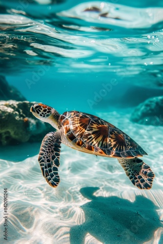An underwater shot capturing multiple sea turtles with a A vivid underwater photograph of a sea turtle gliding above a sandy seafloor in a clear blue ocean