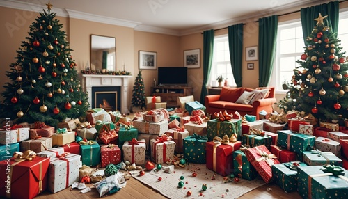 An untidy living room filled with crumpled holiday gift wrap and broken ornaments, reflecting the aftermath of Christmas celebrations, Generative AI