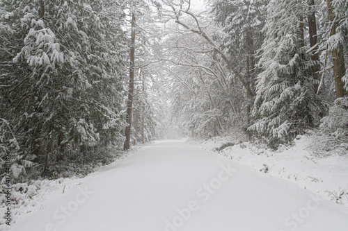 An untraveled road in winter covered in fresh snow through a forest.