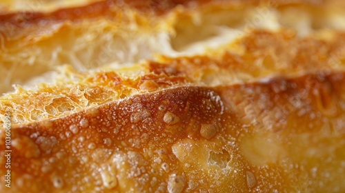 An upclose look at a baguette showing off its crispy exterior and airy chewy interior.