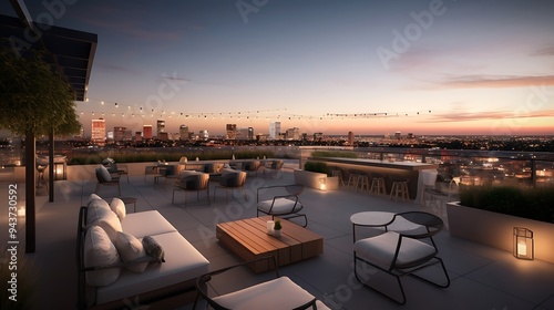 An urban rooftop lounge featuring modern seating and vibrant atmosphere