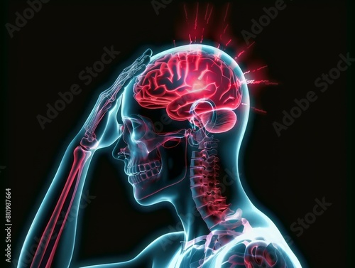 An x ray of the human head with an illuminated brain showing signs of pain on top of it