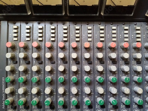 Analogue mixing console channels showing eq section and phantom power buttons line mic switch,stereo mono switches