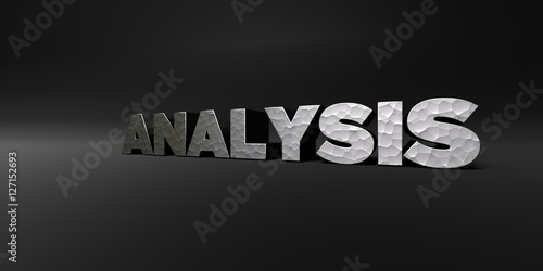 ANALYSIS - hammered metal finish text on black studio - 3D rendered royalty free stock photo. This image can be used for an online website banner ad or a print postcard.
