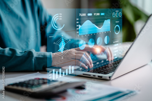 Analyst use a laptop analyze the dashboard virtual screen for data reports business and Data Management Systems with KPIs and metrics connected to the database for technology finance, sales, marketing