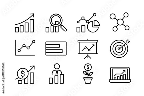 Analytics icon set. Data analysis, business growth chart. Financial report, marketing statistics, profit graph. Infographic line icons for web, apps. Editable stroke vector.