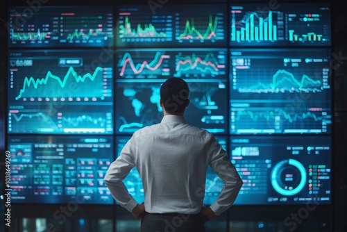 Analyzing big data technology in business finance with detailed analytics and stock trends displayed on digital screens