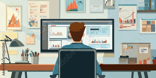 Analyzing Data Graphs Charts Businessman Workplace Office Desk Computer Screen Statistics Information Technology