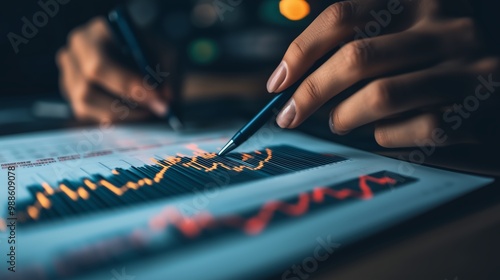 Analyzing financial data trends with a pen in a dimly lit office during evening hours