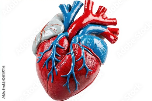 Anatomical heart model displaying detailed structures and colors, isolated on a white background.