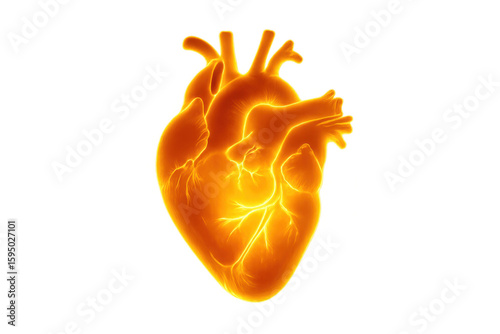 Anatomical heart model glowing bright orange, revealing intricate cardiac details against transparent backdrop
