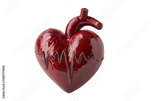 Anatomical heart model with electrocardiogram line on a trasparent background