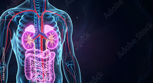 Anatomical human body illustration featuring veins kidneys intestines and other organs for educational health and science purposes