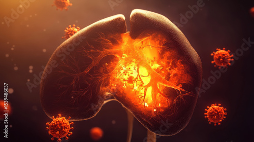 Anatomical Human Liver Surrounded by Glowing Viral Particles Representing Damage and Inflammation from Hepatitis A