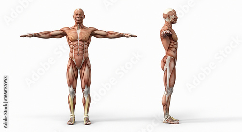 Anatomical human muscle system front and side view detailed 3d render for medical and fitness education