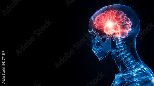 Anatomical illustration highlighting a human skull and brain, showcasing brain activity in a striking and educational manner.