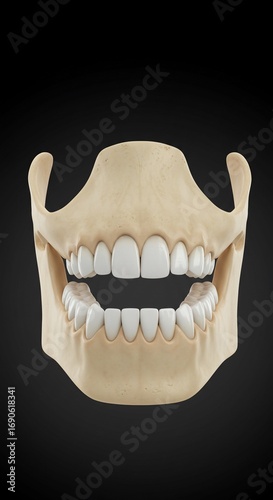 Anatomical model showing the human jaw bone and teeth in a full set on a black background view
