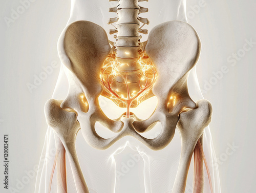Anatomical view of human pelvis with detailed bones and surrounding structures