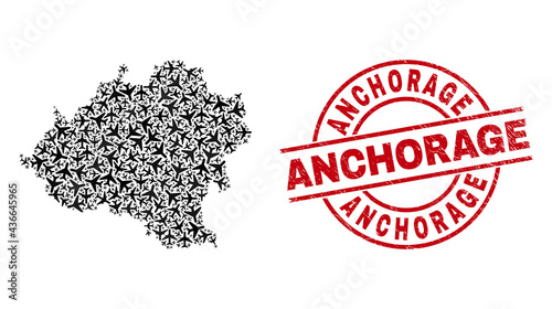 Anchorage rubber seal, and Soria Province map collage of airliner elements. Collage Soria Province map designed of air force symbols. Red seal with Anchorage tag, and scratched rubber texture.
