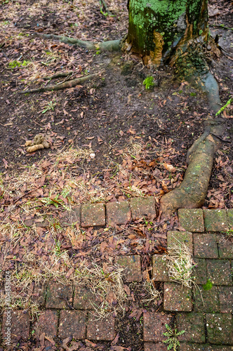 Ancient cobblestone pavement is broken by the powerful root of a tree growing nearby.