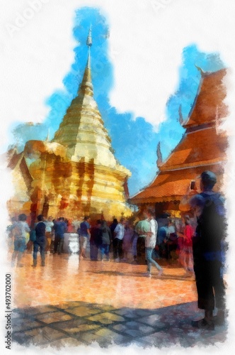 Ancient Architecture Council of Wat Phra That Doi Suthep in Chiang Mai Thailand watercolor style illustration impressionist painting.