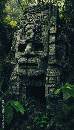 Ancient aztec ruins hidden in lush jungle with mosaics and stone sculptures of animals