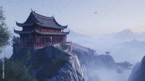 Ancient Chinese temple perched on a mountain peak, misty atmosphere, curved rooflines, historical style