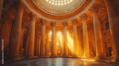 Ancient Circular Temple Interior Soft Sunlight Stone Carvings Neoclassical Pillars Serene Atmosphere