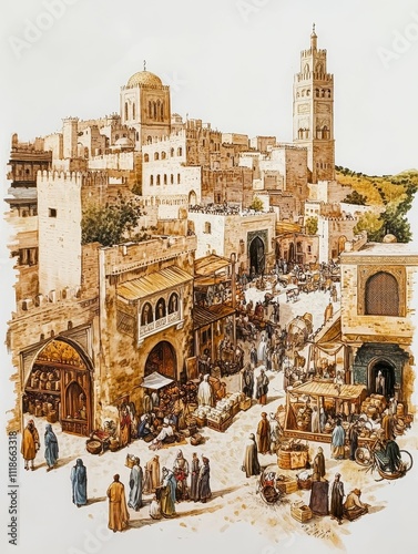 Ancient city marketplace, bustling crowd, architecture.
