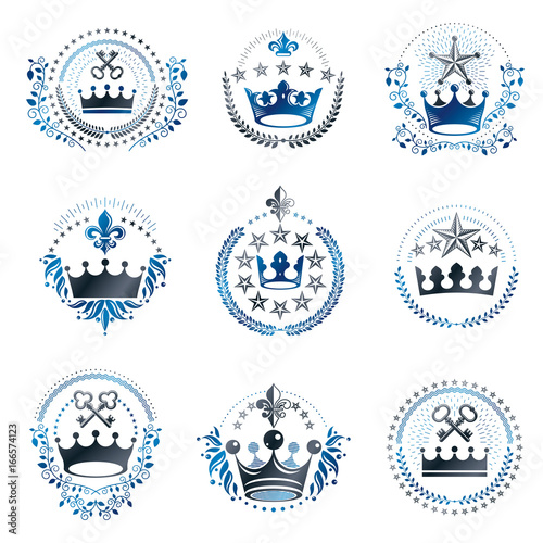 Ancient Crowns emblems set. Heraldic vector design elements collection. Retro style label, heraldry logo.