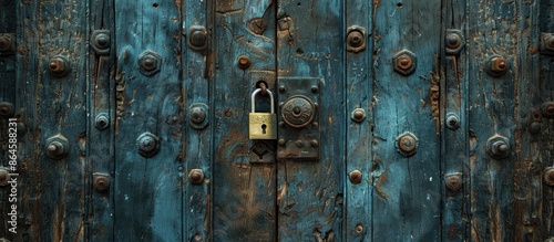 Ancient door adorned with an old padlock in the center, emphasizing its antiquity with a rustic charm, creating a mesmerizing sight for a copy space image.
