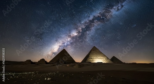 Ancient Egyptian pyramids under a spectacular night sky with the Milky Way.