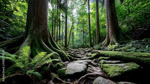 Ancient Forest Path Mossy Stones with Sunlight Dappled.