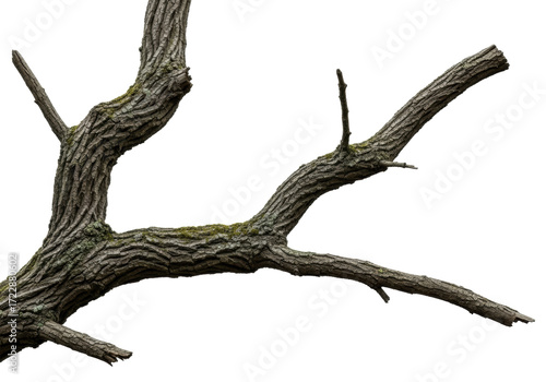 Ancient, gnarled oak branches with intricate bark and subtle moss, isolated on transparent with copy space, studio macro, sharp focus, concept of natural enduring strength