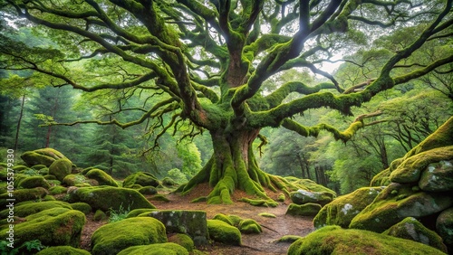 Ancient gnarled tree standing alone in a clearing surrounded by tall ferns and moss-covered boulders, ancient, boulders, tree trunk