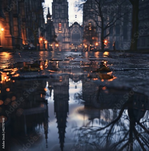 Ancient Gothic Czech architecture reflected on wet asphalt