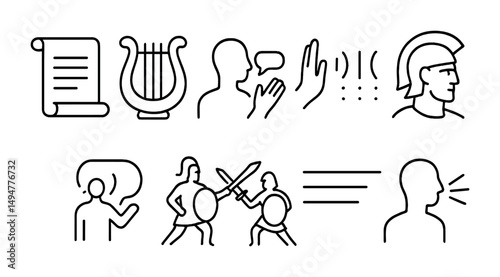Ancient greece line icons set – outline, silhouette, historical art symbols