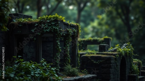 Ancient jungle ruins overgrown with lush green vines intense black and deep shadows