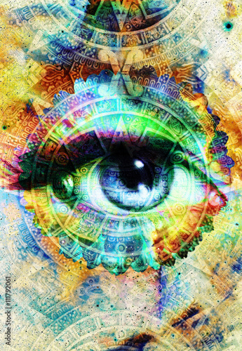 Ancient Mayan Calendar and woman eye, abstract color Background, computer collage.