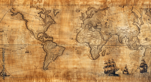 Ancient medieval map of the world with continents and countries, and decorative drawings of ships, with parallels and meridians in the background, on weathered paper. Discovery wallpaper.