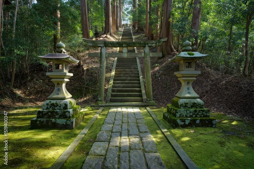 Ancient moss-covered stone path leading to tall stairs framed by a traditional stone torii gate and flanked by two stone lanterns in a serene forest