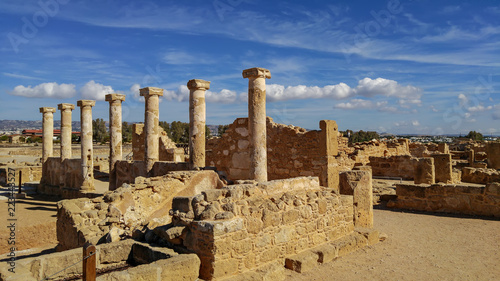 Ancient ruins of Kourion city near Pathos and Limassol, Cyprus. Row of columns under blue sky. Travel outdoor background