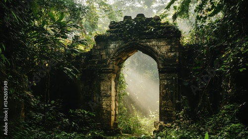 Ancient Stone Archway Surrounded by Lush Dense Jungle Landscape