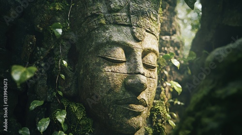 Ancient Stone Face Enveloped by Lush Jungle Vegetation Serene and Timeless Sculpture Amidst Na