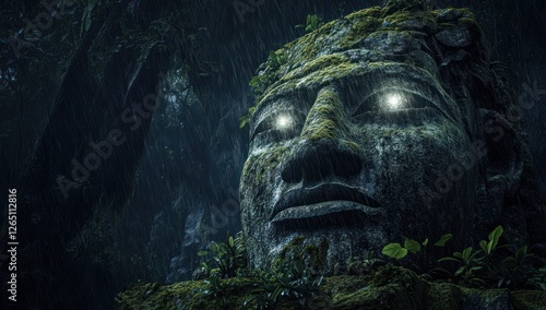 Ancient stone face statue in jungle, glowing eyes, rain.