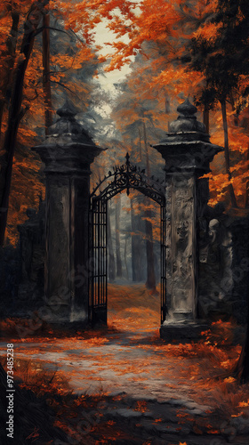 Ancient stone gate to the underworld surrounded by mystical autumn forest with falling leaves and misty atmosphere. Mysterious portal entrance with eerie glow in enchanted woodland.